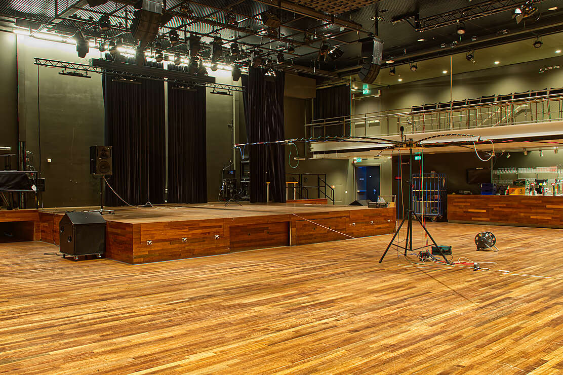 It is a wide, semi-circular room with only seats. The distance between visitors and artists is small at every point in the hall. Even from the two balconies, a seat offers an unobstructed view of the stage. The fully wooden interior and comfortable chairs further contribute to the warm and friendly atmosphere.