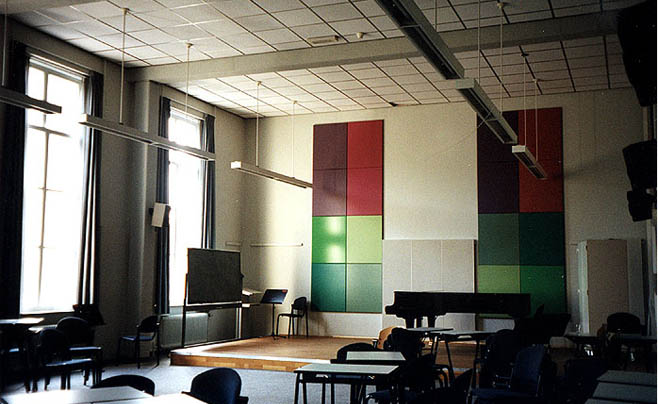 A beautiful intimate brick and plaster chamber music hall in the heart of one of the buildings of the Universitaet Der Kuenste of Berlin, Germany. The room is flooded with daylight in its most wet setting, and becomes significantly dryer when the curtains are lowered.
